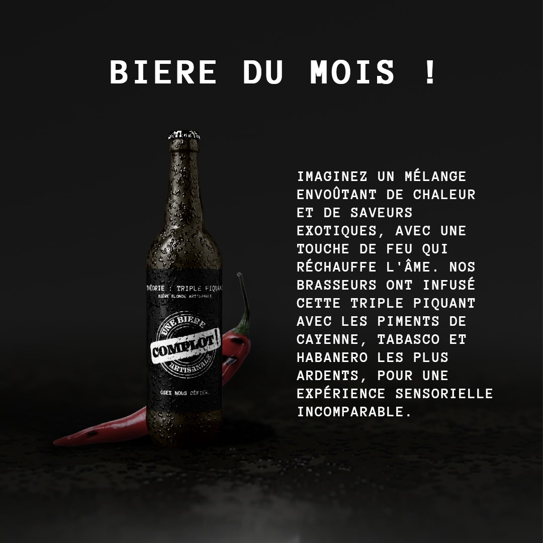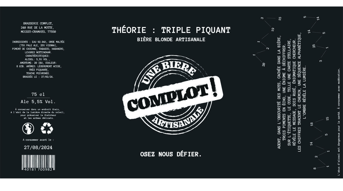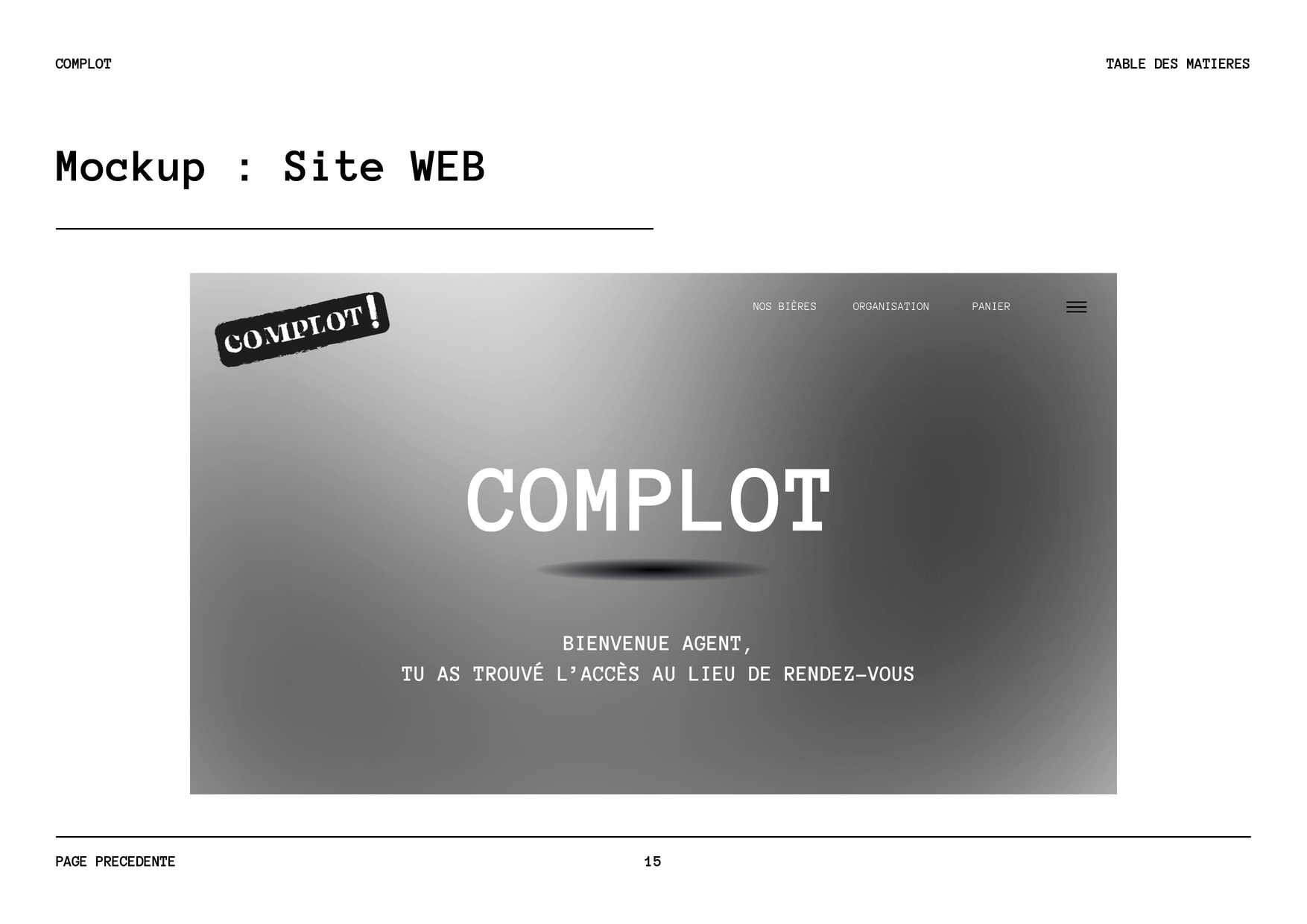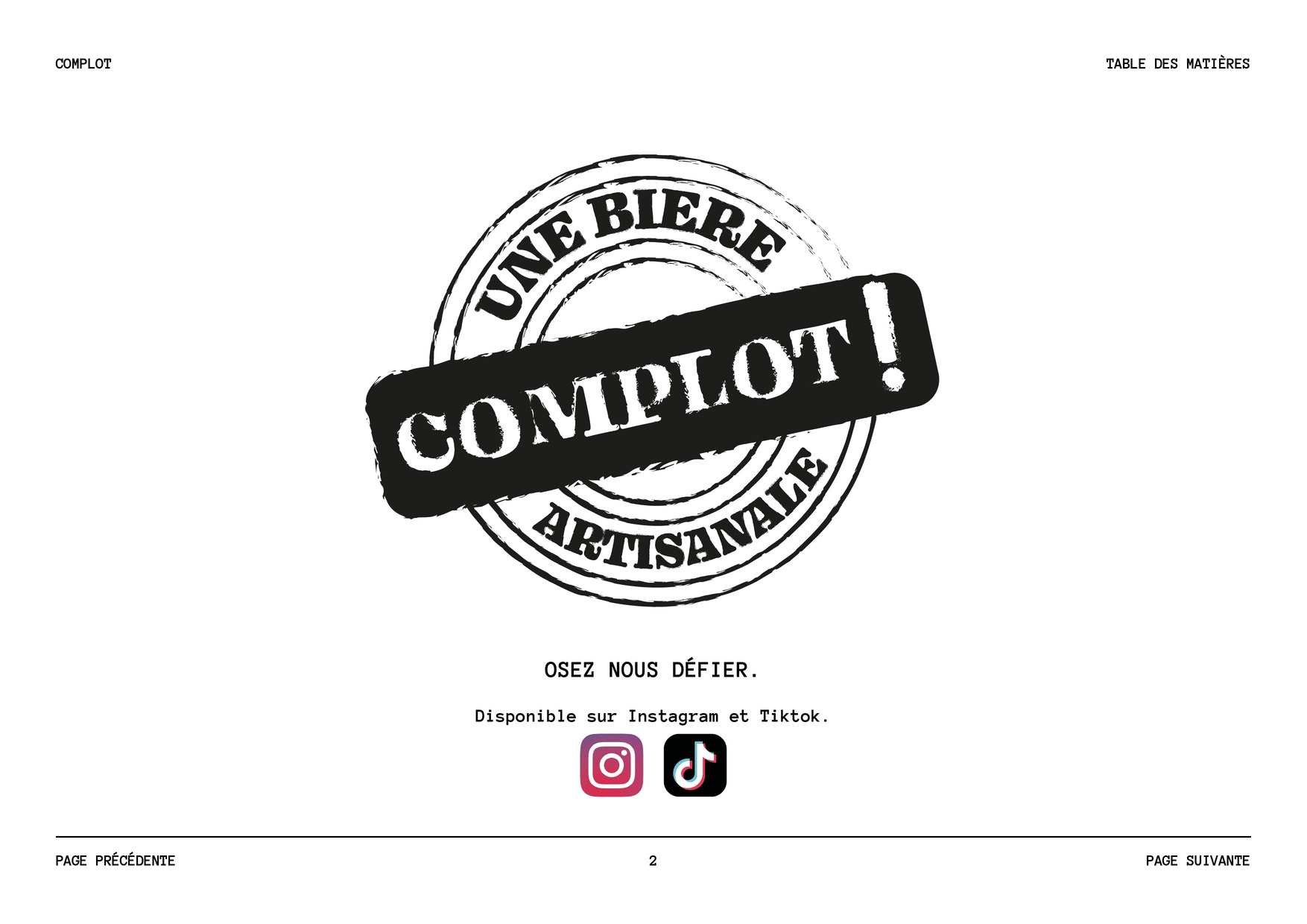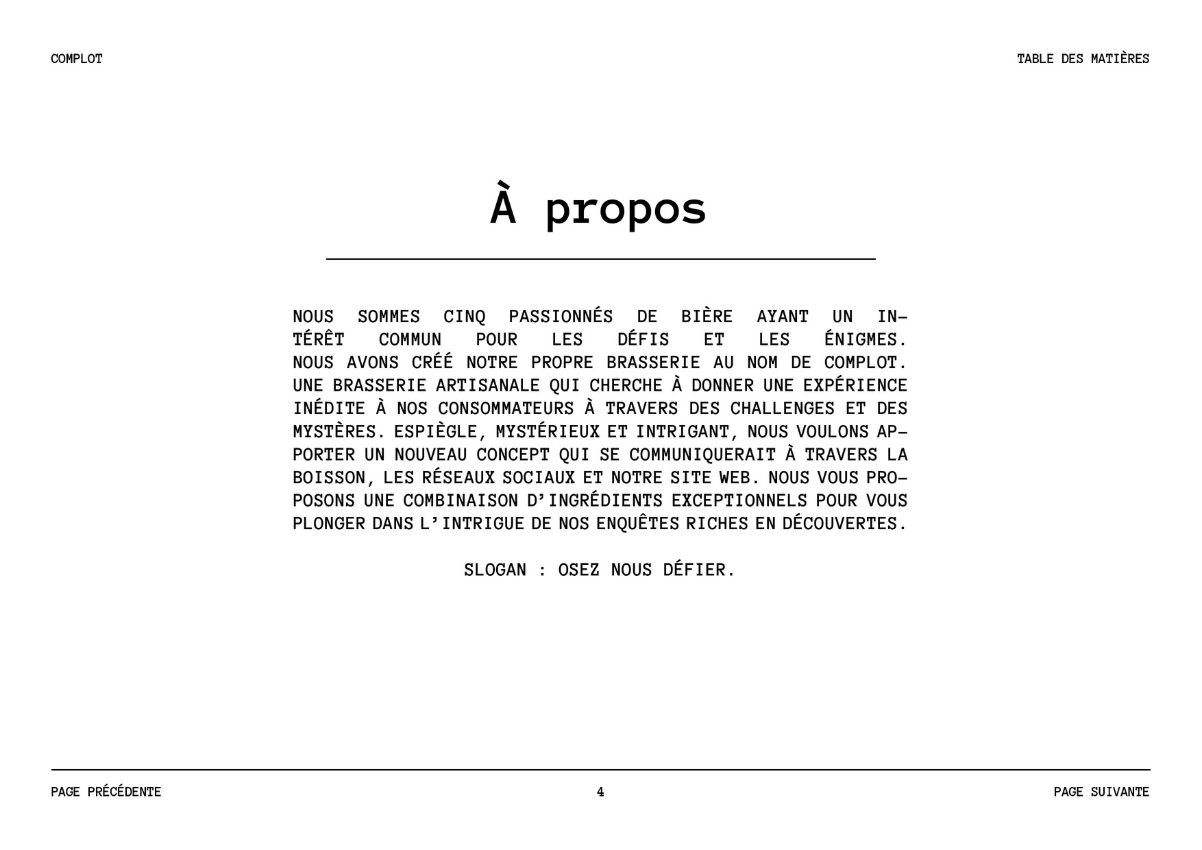 Nous sommes cinq passionnés de bière ayant un intérêt commun pour les défis et les énigmes. Nous avons créé notre propre brasserie au nom de complot. Une brasserie artisanale qui cherche à donner une expérience inédite à nos consommateurs à travers des challenges et des mystères. Espiègle, mystérieux et intrigant, nous voulons apporter un nouveau concept qui se communiquerait à travers la boisson, les réseaux sociaux et notre site web. Nous vous proposons une combinaison d’ingrédients exceptionnels pour vous plonger dans l’intrigue de nos enquêtes riches en découvertes.